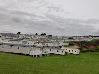 Jurassic marker above Exmouth showing the different layers of rockThe path is busy as it is Sunday, and narrow. Before long we are in the larges caravan site I have ever seen. It is so big that we can’t get out of it to eat our M & S sandwiches bought in Exmouth. We sit rather gloomily on a bench with a view of – caravans.